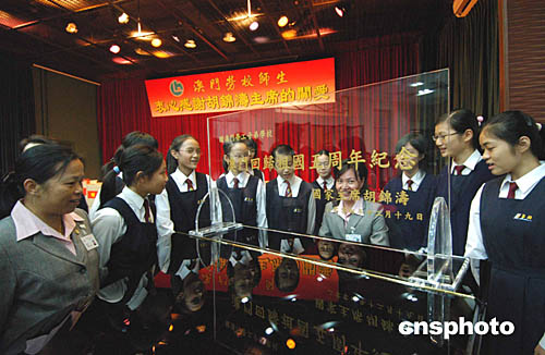 | 十九日下午,國(guó)家主席胡錦濤參觀(guān)澳門(mén)勞工子弟學(xué)校,并向?qū)W校贈(zèng)送了一臺(tái)鋼琴,當(dāng)胡主席離開(kāi)后,師生們迫不及待地用新鋼琴?gòu)椘鹆恕拔业淖鎳?guó)”等名曲。作者:梁永強(qiáng)