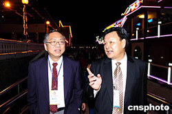 圖為丘成桐教授在廣東省僑辦主任呂偉雄的陪同下游覽珠江夜景。