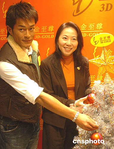 香港影視紅星古天樂(lè)(左)23日在香港金至尊主席伍綺媚的陪同下﹐出席銅鑼灣又一新店的開業(yè)儀式﹐并許下圣誕愿望掛于樹上﹐求得平安。