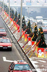 十二月二十四日,北京東三環(huán)農(nóng)展橋兩邊立起了一百多棵圣誕樹,并在路旁裝點(diǎn)了彩色的塑料花,為節(jié)日增添了喜慶的氣氛。作者:韓藝冰