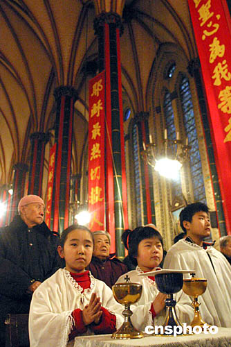 北京西什庫天主教堂舉行盛大彌撒。圖為奉獻(xiàn)班的孩子在彌撒中。作者:張勤