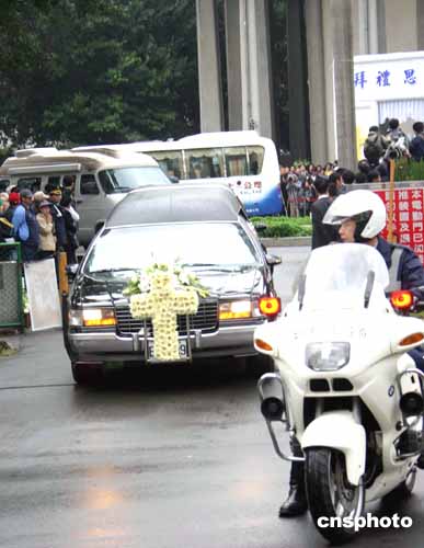 裝有蔣方良遺體的棺木,在其家屬護送下正抬出介壽堂,送上靈車,準備到基隆火化。作者:黃少華