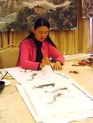 十二月二十九日,在“紀(jì)念人民藝術(shù)家齊白石誕辰一百四十周年全國書畫萬里行”廣州站的展覽、筆會(huì)活動(dòng)上,藝術(shù)大師齊白石孫女齊慧娟面向廣州市民即席揮毫作畫。作者:郭軍