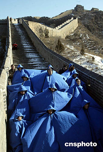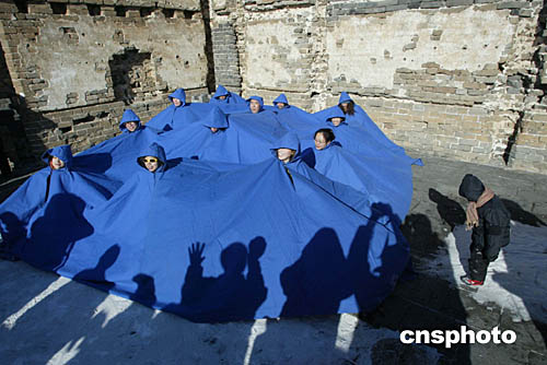一月三日,十二名中國藝術(shù)家在北京古老的長城上,演繹法國藝術(shù)家尼可拉的行為藝術(shù)作品《藍(lán)斗篷和中國藝術(shù)家》。中新社記者:史利