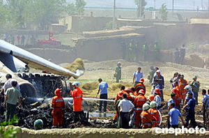 據(jù)報(bào)道,墜機(jī)現(xiàn)場濃煙滾滾,民航、空軍、國際機(jī)場的救援車包括地方的消防車都已經(jīng)到位。