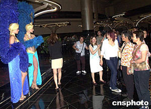 首間來自美國拉斯韋加斯大型娛樂場酒店“金沙娛樂場”十八日在澳門開幕,來自美國拉斯韋加斯的艷舞女郎在現(xiàn)場迎接客人,使澳門市民及游客大開眼界。中新社記者:李剛