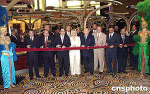 首間來自美國拉斯韋加斯大型娛樂場酒店“金沙娛樂場”十八日在澳門開幕,澳門“賭王”何鴻燊親自到場向金沙高層人士表示祝賀。中新社記者:李剛