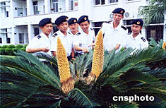 被廣東湛江評(píng)為“花園式單位”的軍港保障部隊(duì)營(yíng)區(qū)內(nèi)五月初出現(xiàn)了一道新風(fēng)景:十余棵鐵樹紛紛吐出了金黃色的花蕊,其中有兩棵還開出了并蒂花。這一罕見(jiàn)奇葩,吸引了不少官兵前來(lái)觀賞。作者:梁利靈