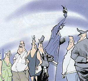 “即便是每個(gè)游客后面跟著一個(gè)警察,也一定要開(kāi)放!”紐約市市長(zhǎng)布隆伯格說(shuō),自由女神像是紐約的象征,一定要爭(zhēng)取在2004年內(nèi)全面開(kāi)放。美國(guó)自由女神像在9·11事件后緊急關(guān)閉。(來(lái)源:中國(guó)《新聞周刊》)