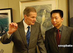 中國首位進入太空飛行的宇航員楊利偉今天下午在華盛頓會晤美國上世紀八十年代的宇航員、現(xiàn)在的國會參議員比爾·納爾遜。