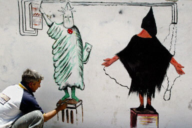 5月23日,一名伊拉克藝術家在巴格達附近的薩德爾城將美軍虐待伊拉克俘虜?shù)恼掌嫷綁Ρ谏,并在旁邊畫上一個美國“自由女神像”。