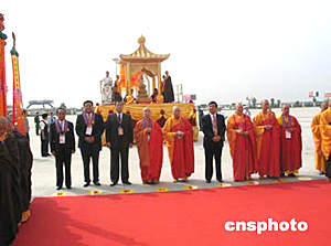 此前,從早晨九時半時開始,在機場停機坪舉行了一個約三十分鐘的恭送儀式。參加的人士有中國佛教協(xié)會會長、內(nèi)地恭送團團長一誠法師;中國佛教協(xié)會副會長圣輝法師;香港佛教聯(lián)合會會長、香港迎請團團長覺光法師;中國國家宗教事務局副局長楊同祥、陜西省副省長張偉等,總人數(shù)為八百多人。