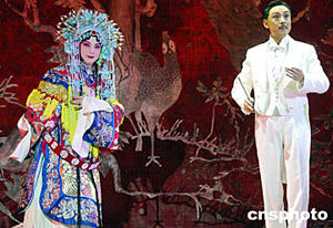 為紀(jì)念中國(guó)最著名的京劇大師梅蘭芳先生誕辰一百一十周年,北京京劇院演出的京劇大型交響劇詩《梅蘭芳》五月二十五日晚走進(jìn)北京大學(xué)百年講堂,如詩如畫的舞臺(tái)設(shè)計(jì)和京劇藝術(shù)家們精湛的演技贏得大學(xué)生的陣陣喝彩。京劇大型交響劇詩《梅蘭芳》擷取了抗日戰(zhàn)爭(zhēng)期間梅蘭芳蓄須明志,拒絕為日本人演出的人生片段。圖為由北京京劇院于魁智(右)扮演的梅蘭芳先生。中新社記者:張勤