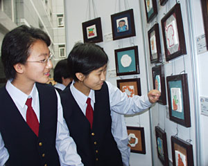 記者在展覽上看到,在寬敞的大廳內(nèi),擺滿了學生創(chuàng)作的作品,包括版畫、民間剪紙、刮畫、紙雕、面具、漫畫、海報、中國結等十多種,內(nèi)容涉及更廣,如環(huán)保、奧運會、行為規(guī)范、國慶等。十四歲的葛雅靜,看上去十分靦腆。這次展覽她如魚得水,有五幅作品入選,是所有參展學生最多的。她的刮畫極富想象力豐富,吸引觀者駐足。據(jù)她說,父母都不是從事藝術工作的,她是上藝術課上后,逐漸發(fā)現(xiàn)自己愛上畫畫了。
