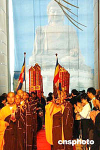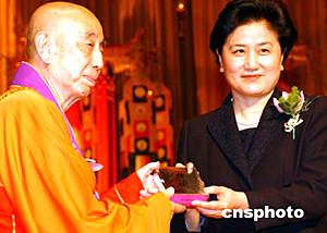 國家宗教局局長葉小文、中國佛教協(xié)會會長一誠法師,五月二十六日在香港會展中心舉行的香港佛教暨各界迎請佛指舍利瞻禮祈福大會儀式上,向香港特首董建華贈送紀(jì)念品。 作者:錢興強(qiáng)