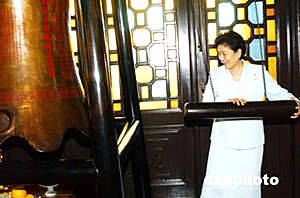 正在香港訪問(wèn)的全國(guó)政協(xié)副主席、中共中央統(tǒng)戰(zhàn)部部長(zhǎng)劉延?xùn)|,五月二十七日來(lái)到香港觀宗寺參觀,在大雄寶殿敲鐘祈福。 作者:錢興強(qiáng)