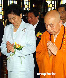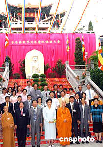 全國(guó)政協(xié)副主席、中共中央統(tǒng)戰(zhàn)部部長(zhǎng)劉延?xùn)|,五月二十七日來(lái)到香港觀宗寺參觀,圖為劉延?xùn)|、國(guó)家宗教局局長(zhǎng)葉小文、覺(jué)光法師、香港特區(qū)民政事務(wù)局局長(zhǎng)何志平等一起在大雄寶殿前合影留念。作者:錢興強(qiáng)