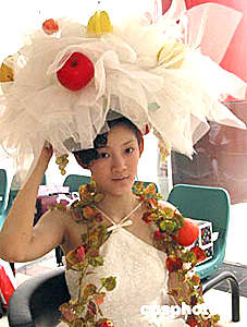 南京金莎二零零四發(fā)型化妝大賽上的水果妝金莎二零零四發(fā)型化妝大賽五月二十七日在南京紫金大戲院舉行,來自江蘇美容美發(fā)業(yè)的二百多名選手參加了剪吹、新娘化妝、形象設(shè)計(jì)等環(huán)節(jié)的比賽。作者:孫愛華