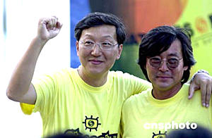 為紀(jì)念鄭和下西洋六百周年,一艘命名為“鳳凰號”的單桅帆船將由翁以煊、鄭浩駕駛于七月十三日從當(dāng)年鄭和寶船開出的南京出發(fā),展開歷時八個月的航海電視行動。圖為五月二十七,“鳳凰號”船員在深圳大鵬灣浪騎游艇俱樂部與媒體記者見面。作者:陳文