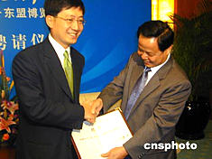 五月二十八日,廣西自治區(qū)主席陸兵(右)在南寧向香港貿(mào)發(fā)局總裁林天福頒發(fā)聘書,聘請(qǐng)他為中國—東盟博覽會(huì)高級(jí)顧問。作者:蔣雪林