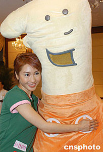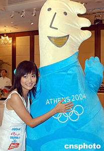 歌星董敏莉5月28日在香港出席無(wú)線電視《雅典奧運(yùn)·上下一心共創(chuàng)新里程》誓師大會(huì),董敏莉被可愛(ài)的奧運(yùn)吉祥公仔吸引。作者:鄧慶樂(lè)