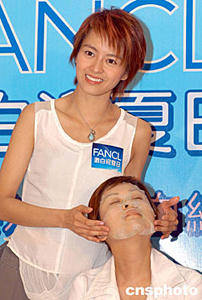 歌星梁詠琪5月29日在香港出席其代言化妝護(hù)膚品《FANCL激白迎夏日》宣傳展覽會(huì),梁詠琪邀請(qǐng)現(xiàn)場(chǎng)觀眾,親自為她敷上面膜。作者:鄧慶樂