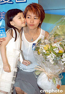 歌星梁詠琪5月29日在香港出席其代言化妝護(hù)膚品《FANCL激白迎夏日》宣傳展覽會(huì),獲小女孩送上鮮花,梁詠琪與她碰面以表謝意。作者:鄧慶樂