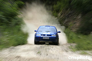 5月29日,2004年全國汽車?yán)﹀\標(biāo)賽“海淀駕校杯”北京拉力賽正式在北京鳳凰嶺拉開帷幕,眾多參賽車隊(duì)在崎嶇的賽道上競爭激烈。中新社記者:盛佳鵬