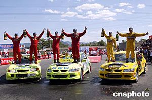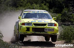 2004年全國汽車拉力錦標賽“海淀駕校杯”北京拉力賽經(jīng)過2天激烈的較量5月30日在北京落下帷幕,由于鳳凰嶺惡劣的路況,參賽的68部賽車今天共有49部賽車參加比賽。N組冠軍被咳速停拉力車隊11號車(中)的英國外援大衛(wèi)·辛吉斯/丹尼爾·巴里特獲得,亞軍是佳通輪胎車隊(右)的劉曹東/周麗,咳速停拉力車隊的劉斌/黃煜獲得第三名。中新社記者:盛佳鵬
