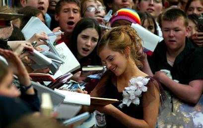 扮演哈利波特的丹尼爾在進(jìn)入影院之前為影迷們?cè)诤?bào)和照片上簽名!罢媸菈延^呀,我好激動(dòng),比紐約首映式的規(guī)模大多了!