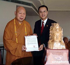 31日,中國(guó)佛協(xié)會(huì)長(zhǎng)一誠(chéng)長(zhǎng)老(左)接受香港佛教文化產(chǎn)業(yè)總經(jīng)理吳達(dá)镕代表贈(zèng)送的珍貴觀音頭象,并應(yīng)聘為香港佛教文化產(chǎn)業(yè)永遠(yuǎn)榮譽(yù)顧問(wèn)。作者:中新社