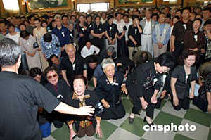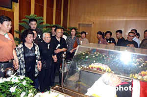 在鄭州市殯儀館內(nèi),記者看到,躺在鮮花叢中的常老是那樣的安詳。鮮花簇擁的靈柩上,覆蓋著一面鮮紅的中共黨旗。靈柩上方,黑紗環(huán)繞著常香玉的照片——花白頭發(fā),寬邊眼鏡,大紅毛衣外罩,端莊慈祥寧靜的笑容,一派優(yōu)雅。雖然其親屬根據(jù)常老的遺愿盡量使儀式簡樸,然而前往吊唁的各界人士一度達到幾千人,整個儀式大廳被圍了個水泄不通。