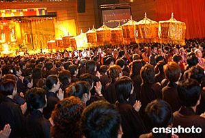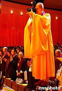 閉幕典禮前,香港佛教界還舉辦了隆重莊嚴(yán)的“圓滿傳供”禮佛儀式。約四千名佛教徒身著法衣,跪拜佛前,在悠揚(yáng)的念佛聲中,依序?qū)ⅰ跋恪薄ⅰ盎ā、“燈”、“果”、“荼”、“食”等供品傳遞到供奉著佛指舍利和三寶佛的禮臺(tái)上,以感念佛陀恩澤,并表達(dá)對(duì)佛陀的最高敬意。整個(gè)儀式長(zhǎng)達(dá)兩個(gè)多小時(shí)。