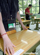六月六日上午,北京四中考場的監(jiān)考員正在考場認真地核對考生姓名及編號。一年一度的中國全國統(tǒng)一高考將于六月七日開始,今年全國普通高校招生報名人數(shù)總計七百二十三萬,較去年凈增一百一十萬名,是歷年來高考報名人數(shù)最多的一年。中新社記者:張勤