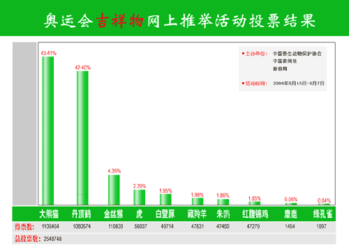 中國新聞社總編輯郭招金說,五百多萬網(wǎng)民踴躍投票,表達自己關注野生動物、保護野生動物、關注人文奧運、參與綠色奧運的熱烈情懷。他稱這次推舉活動展示的是東方人文精神的回歸,是東方文化“天人合一”的精髓的熱烈表達。