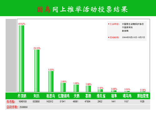 這項由中國野生動物保護協(xié)會、中國新聞社、新浪網(wǎng)聯(lián)合全國二十多家新聞網(wǎng)站舉辦的活動,在規(guī)模、規(guī)格、權威與影響上創(chuàng)造了此類推舉活動的全國之最。主辦單位今天介紹,在嚴格身份認證的情況下,二十多天的推舉活動期間,全國三十個省市自治區(qū)以及東南亞華僑、華人在內的五百萬網(wǎng)民參與了投票。引人注目的中國傳統(tǒng)文化鳥丹頂鶴集中了網(wǎng)民近六成的投票,即便是在吉祥物推舉中,也僅以微弱差距屈居第二。