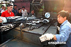 六月八日下午,發(fā)生坍塌事故的北京大安山煤礦的工人正準備將大批鉆桿運往井下。六月六日,位于北京郊區(qū)的大安山煤礦發(fā)生礦井塌冒事故,井下十名礦工被困。為了直接進入坍塌地點營救被困礦工,救援人員目前正在全力打通巷道,如果進展順利,九日上午可望打通。六月八日,救援人員已成功向坍塌地點注入氧氣。中新社記者:張煒