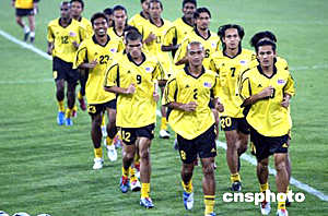 六月八日,馬來西亞足球隊在天津泰達(dá)足球場進(jìn)行適應(yīng)場地訓(xùn)練。二零零六年世界杯足球賽亞洲區(qū)預(yù)賽中國隊對馬來西亞隊的比賽將于六月九日晚在這里舉行。中新社記者:毛建軍