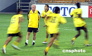 六月八日,馬來西亞足球隊在天津泰達(dá)足球場進(jìn)行適應(yīng)場地訓(xùn)練。二零零六年世界杯足球賽亞洲區(qū)預(yù)賽中國隊對馬來西亞隊的比賽將于六月九日晚在這里舉行。圖為馬來西亞主教練哈里斯正對隊員進(jìn)行現(xiàn)場指導(dǎo)。中新社記者:毛建軍