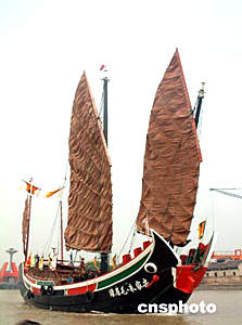 “綠眉毛”仿古木帆船六月八日晚抵達(dá)鄭和七下西洋起錨地江蘇太倉(cāng)劉家港。六月九日上午,太倉(cāng)市人民政府為“綠眉毛”舉行起錨出海儀式,以紀(jì)念近六百年前鄭和七次從太倉(cāng)起錨。圖為“綠眉毛”駛離太倉(cāng)海發(fā)碼頭。作者:姜振華