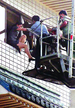 4時(shí)32分,“靠近!再靠近!”四層一個(gè)窗口,兩名消防員對(duì)著云梯喊著。云梯穩(wěn)穩(wěn)地靠在窗口,一名女子被抬出,“快抱被子來!給她蓋上!”大廈一名女領(lǐng)班聲音已沙啞!瓣P(guān)門!快走!”救護(hù)車呼嘯而去。