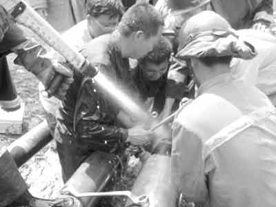 據(jù)朝陽(yáng)市消防局副局長(zhǎng)姚安介紹:“我們共出動(dòng)70余名官兵、10臺(tái)消防車。由于汽油管道發(fā)生炸裂,引起了另一條柴油輸送管道的法蘭盤(管道的接頭)向外泄漏柴油,現(xiàn)在這7條輸油管道每條里都有5噸油,一旦引爆后果不堪設(shè)想。我們用兩臺(tái)泡沫滅火車和若干水槍給管道降溫,同時(shí)用來(lái)稀釋泄漏的柴油,并更換法蘭盤!