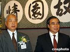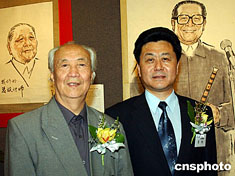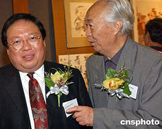 “邵華澤、李琦、馮真書畫展”六月十四日在香港大會堂開幕,圖為邵華澤與《大公報》副社長在書畫展上。中新社記者:錢興強