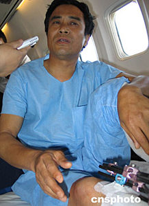 六月十四日十八時(shí)許,在阿富汗恐怖襲擊中受傷的五名中國(guó)工人,乘專機(jī)抵達(dá)烏魯木齊國(guó)際機(jī)場(chǎng)。飛機(jī)停留一小時(shí)后直接飛往濟(jì)南,他們將在濟(jì)南的醫(yī)院進(jìn)行救治。圖為受傷最重的席守忠向記者講述事件經(jīng)過(guò)。作者:程勇
