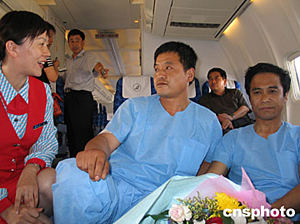 六月十四日十八時(shí)許,在阿富汗恐怖襲擊中受傷的五名中國(guó)工人,乘專機(jī)抵達(dá)烏魯木齊國(guó)際機(jī)場(chǎng)。飛機(jī)停留一小時(shí)后直接飛往濟(jì)南,他們將在濟(jì)南的醫(yī)院進(jìn)行救治。圖為傷員與乘務(wù)人員交談。作者:程勇
