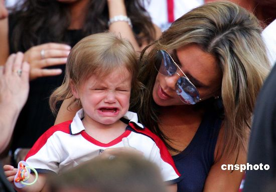當(dāng)?shù)貢r間6月13日晚,在葡萄牙里斯本光明球場進(jìn)行的歐洲杯B組比賽中,英格蘭以1:2敗給法國。圖為坐在觀眾席上的貝克漢姆小兒子羅密歐,可能是因英格蘭輸球而痛哭流涕。Ic/cnsphoto 攝