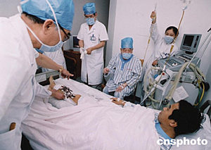 在阿富汗恐怖襲擊事件中受傷的四名中國(guó)工人住進(jìn)山東省立醫(yī)院后,六月十六日,該院八十五歲的老專家張學(xué)彬(中)不顧自己患病在身,前往受傷者病房看望傷員,為傷員檢查傷情。中新社記者:張偉