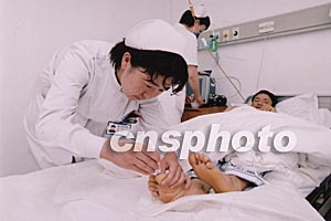 在阿富汗恐怖襲擊事件中受傷回國(guó)治療的四名中國(guó)工人住進(jìn)山東省立醫(yī)院后,受到了醫(yī)護(hù)人員無(wú)微不至的關(guān)懷。圖為山東省立醫(yī)院護(hù)士在為傷員席守忠修剪腳趾甲。中新社記者:張偉