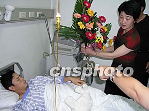 六月十六日中午 ,江西省廣豐縣政府一行六人專程赴濟(jì)慰問(wèn)正在山東省立醫(yī)院接受救治的在阿受傷工人。圖為廣豐縣副縣長(zhǎng)祝美清(持花者)在看望受傷的江西籍工人徐啟松。作者:胡洪林