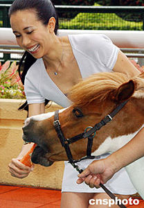香港歌星莫文蔚,六月十七日出席“2003/2004香港賽馬會冠軍人馬頒獎典禮”打氣活動,在跑馬地馬場兩只可愛的雪特蘭小馬向她致送薄荷糖。中新社記者:錢興強(qiáng)